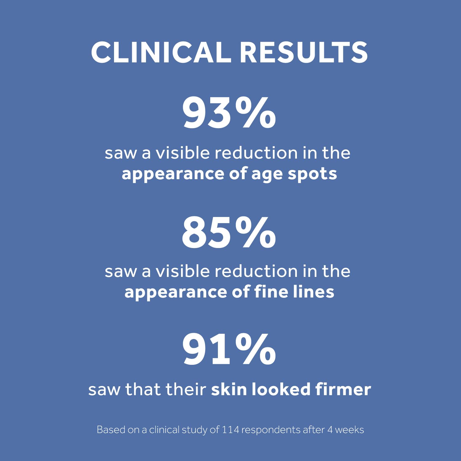- Clinical Results - 114 respondents found that after 4 weeks of using this face makeup, 93% saw a visible reduction in the appearance of age spots, 85% saw a visible reduction in the appearance of fine lines and 91% saw that their skin looked firmer.*