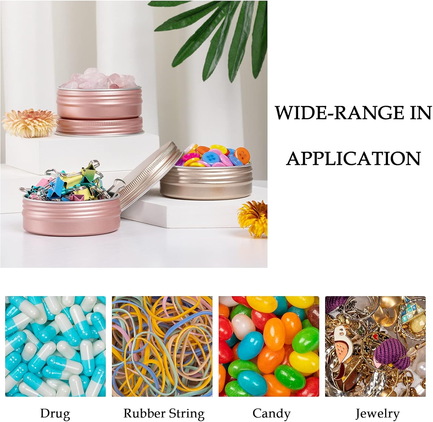 - APPLICATION: Our food-grade aluminum tin containers are dynamic storage jars, ideal choice for storing a wide variety of items like crafts, lip balms, lip gloss, mini candles, cosmetics, sample pots, herbs, handmade lotions