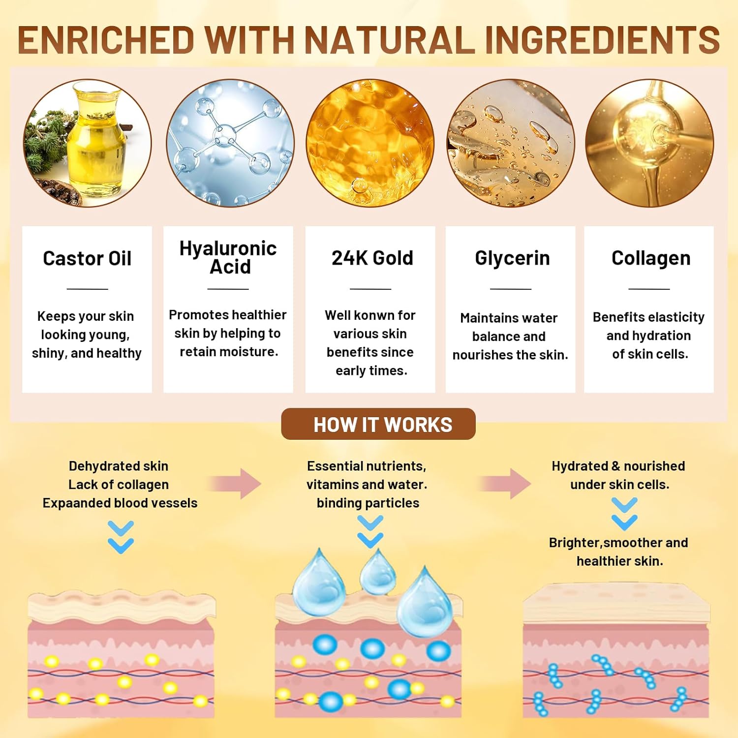 - Material : collagen hyaluronic acid, retinoids, vitamin C, gold powder