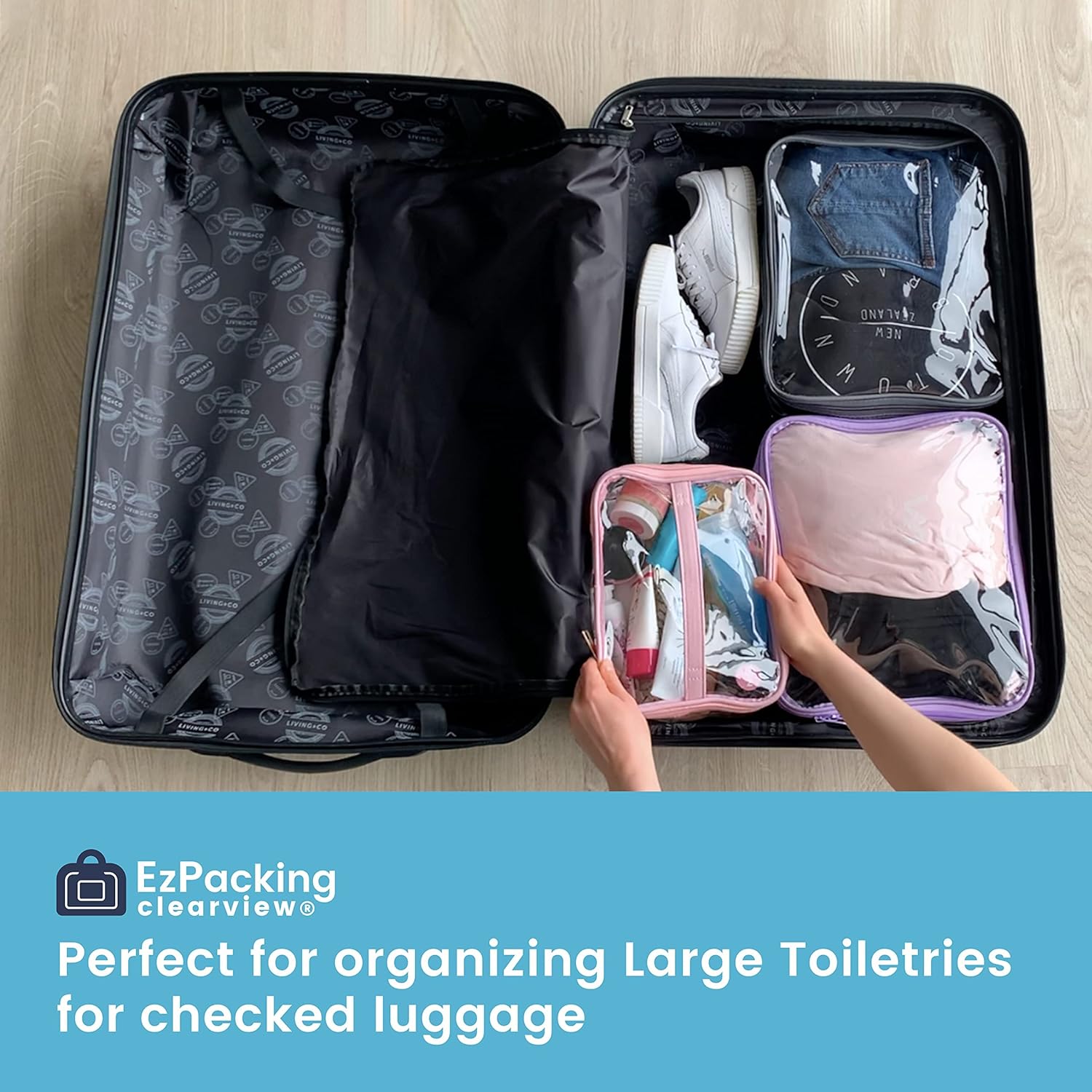 - LARGE CAPACITY: Our clear makeup pouch is cute & spacious and fits your full size cosmetics, brushes, & other beauty products.