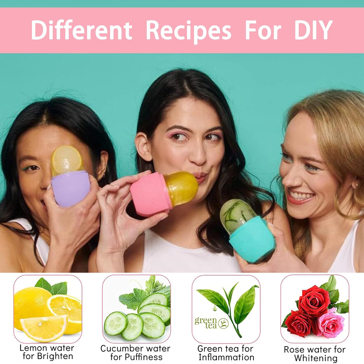 - 3.【Customized recipes】Customized recipes: To truly enhance the skin beautification effect, you can use your creativity to customize another formula according to your specific skin needs, such as whitening lemonade, anti-inflammatory green tea, anti-swelling cucumber water, and skin-improving coconut milk. You can use a juicer to squeeze them into juice, then add water, essential oils and roses to the ice tray, wait for 3-4 hours, then you can use it