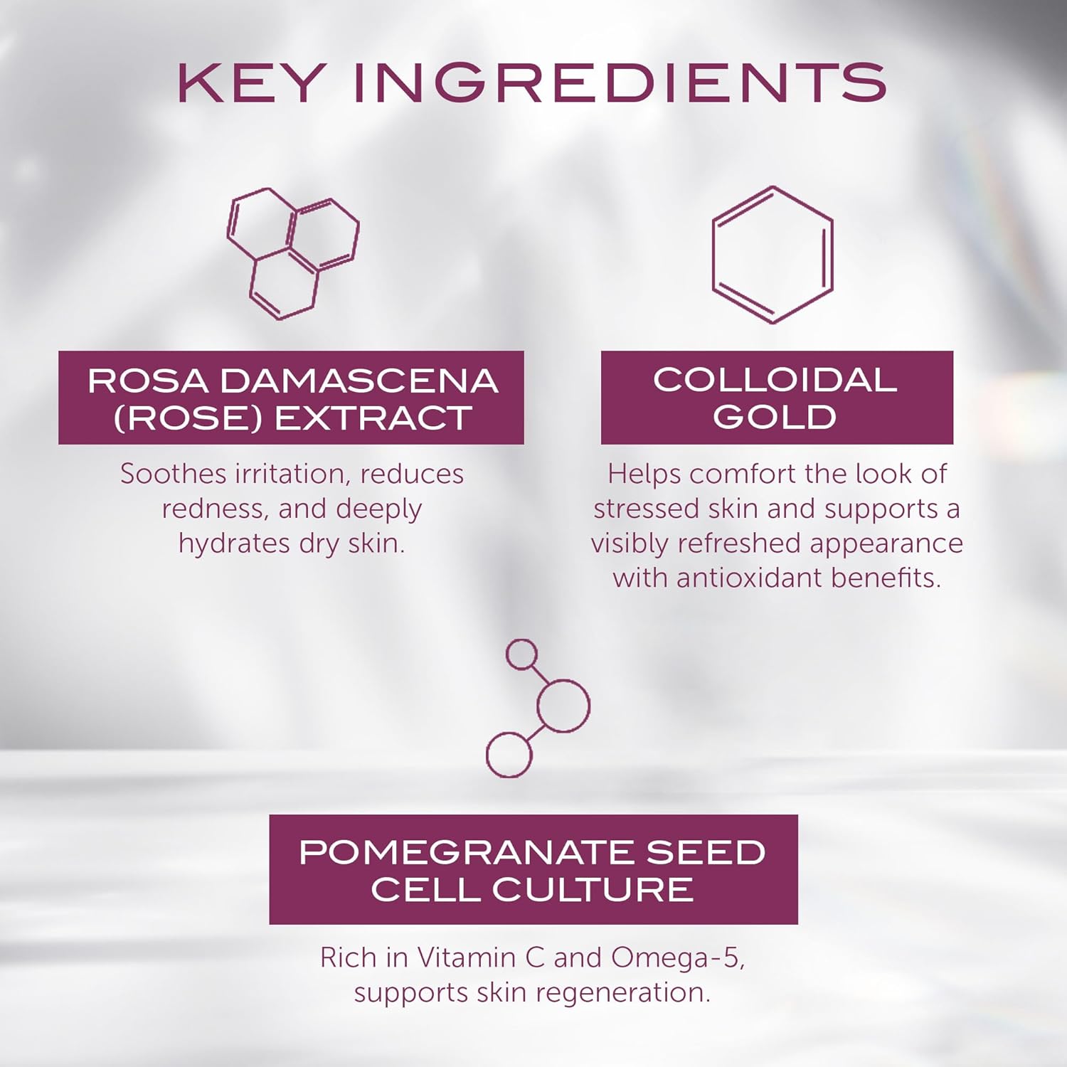 - Rose Gold: Rose is a botanical extract high in antioxidants which helps to protect the skin against external aggressors. Gold extract brightens, evens skin tone, and improves circulation.