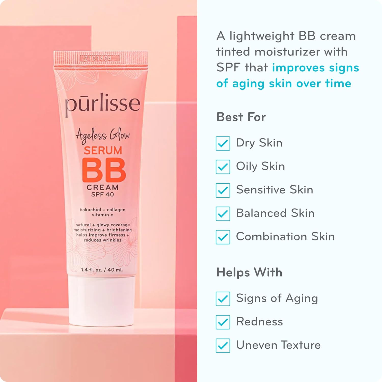 pūrlisse Ageless Glow Serum BB Cream SPF 40 - Glow BB Cream with SPF Enriched with Bakuchiol & Vitamin C to Help Improve Firmness & Reduce Wrinkles for Dewy Skin - Light Medium (1.4 oz)