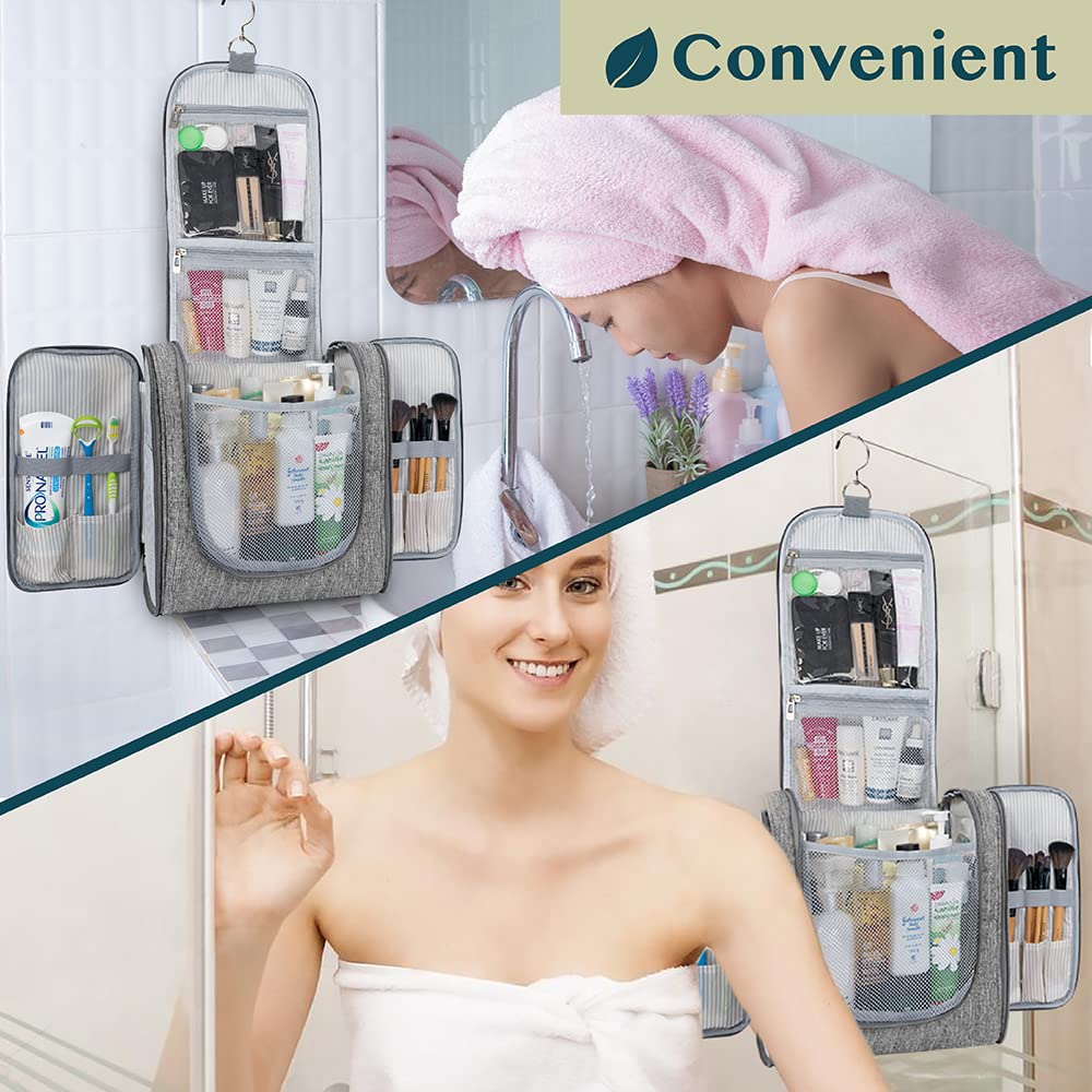 - COSMETICS TRAVEL BAG ORGANIZER: This toiletry bag for women has a hanging hook and multiple pockets that help you stay organizer during business trip, vacation travel. The hanging hook makes it easy to hang the toiletry bag to bars in the hotel shower bathroom. Unzip your toiletry bag to reveal compartments to organize your shampoo, skincare face hygiene products. This toiletry travel bag is an essential accessory for cruise in Europe, plane, Hawaii Trip, and honeymoon.