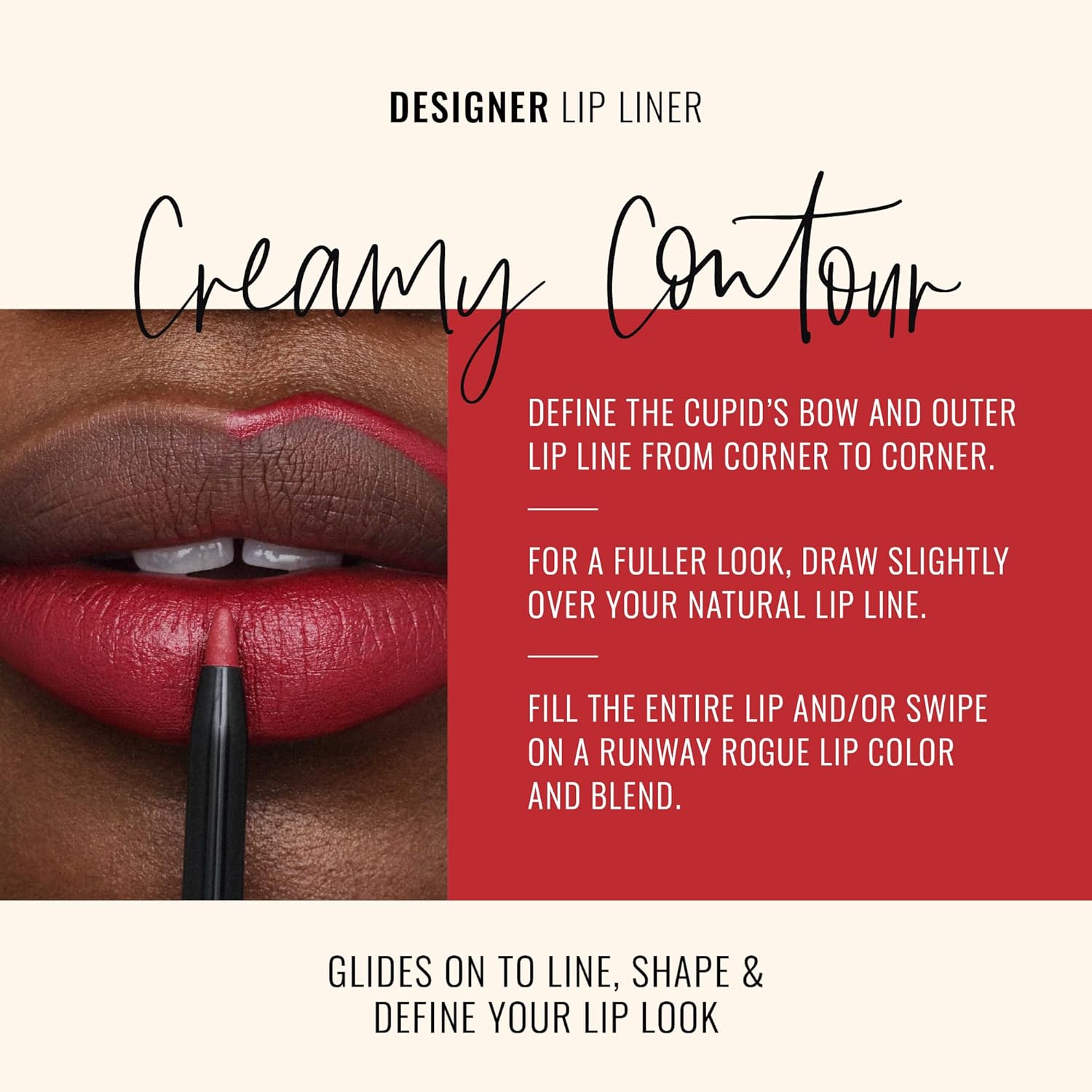 - MATTE LIP LINER PENCIL: Designer Lip Liner is a creamy matte lip pencil designed to help contour and enhance your natural lip shape, keep your lipstick in place, and prevent lipstick from feathering and bleeding while also improving its long wear and lip color. ‘In the Press’ is a crimson dark-red lip liner shade.
