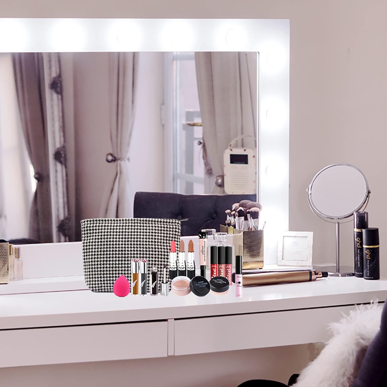 Makeup Bags for Purse Zipper Cosmetic Pouch Large Travel Canvas Make Up Organizer Tool Pouch for Women and Girls,Houndstooth Black