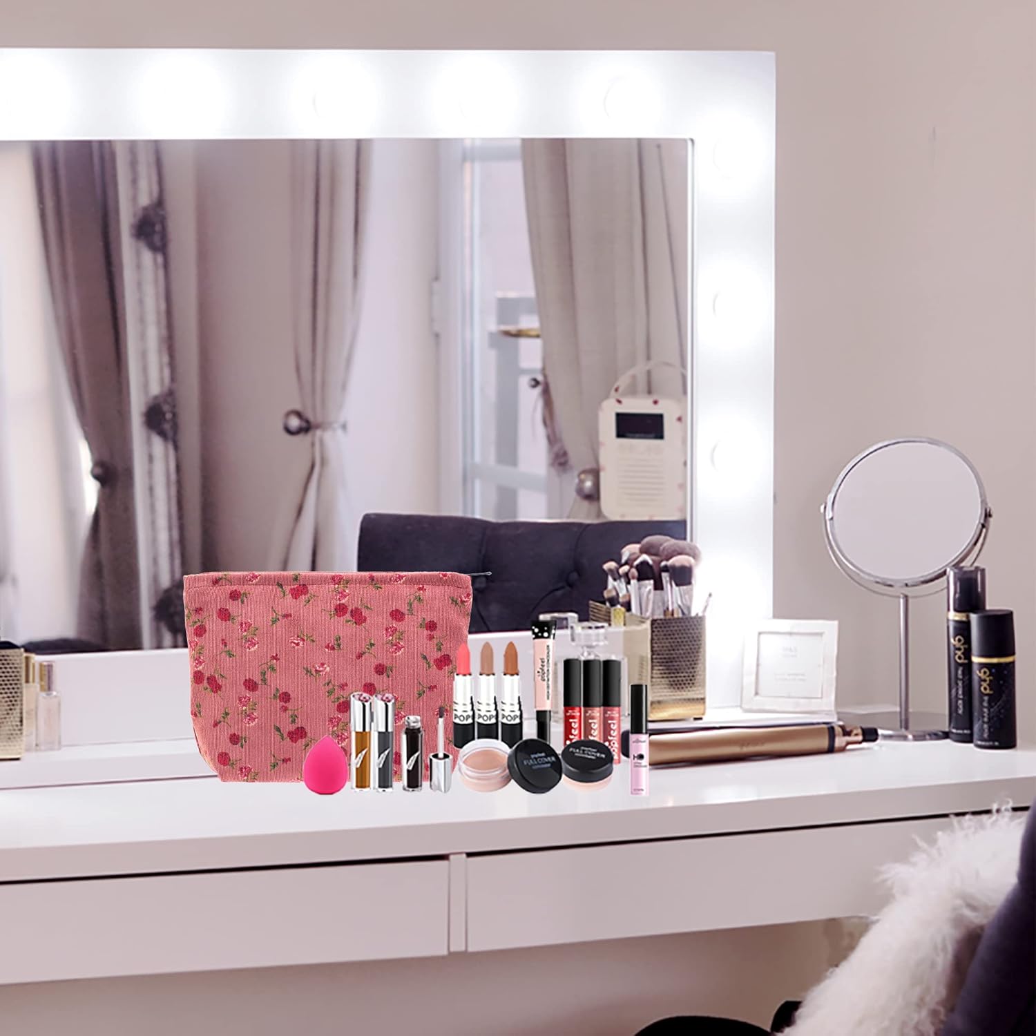 PAZIMIIK Makeup Bag Large Zipper Corduroy Make Up Pouch for Purse Travel Canvas Cosmetic Organizer for Women Brush Storage,Vintage Rose Red