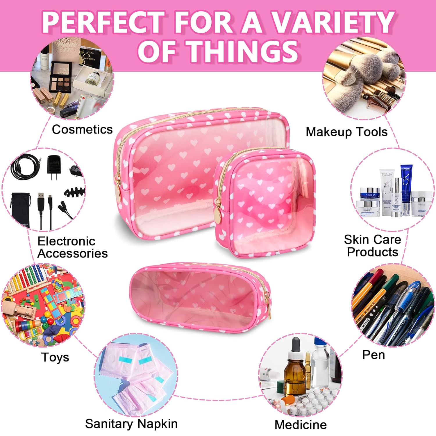Clear Small Makeup Bag with Zipper, Nylon&PVC Cosmetic Travel Bag Preppy TSA Approved Toiletry Bag for Women Girls, Transparent Waterproof Makeup Pouches Cute Travel Bag for Purse(Small-Pink Heart)
