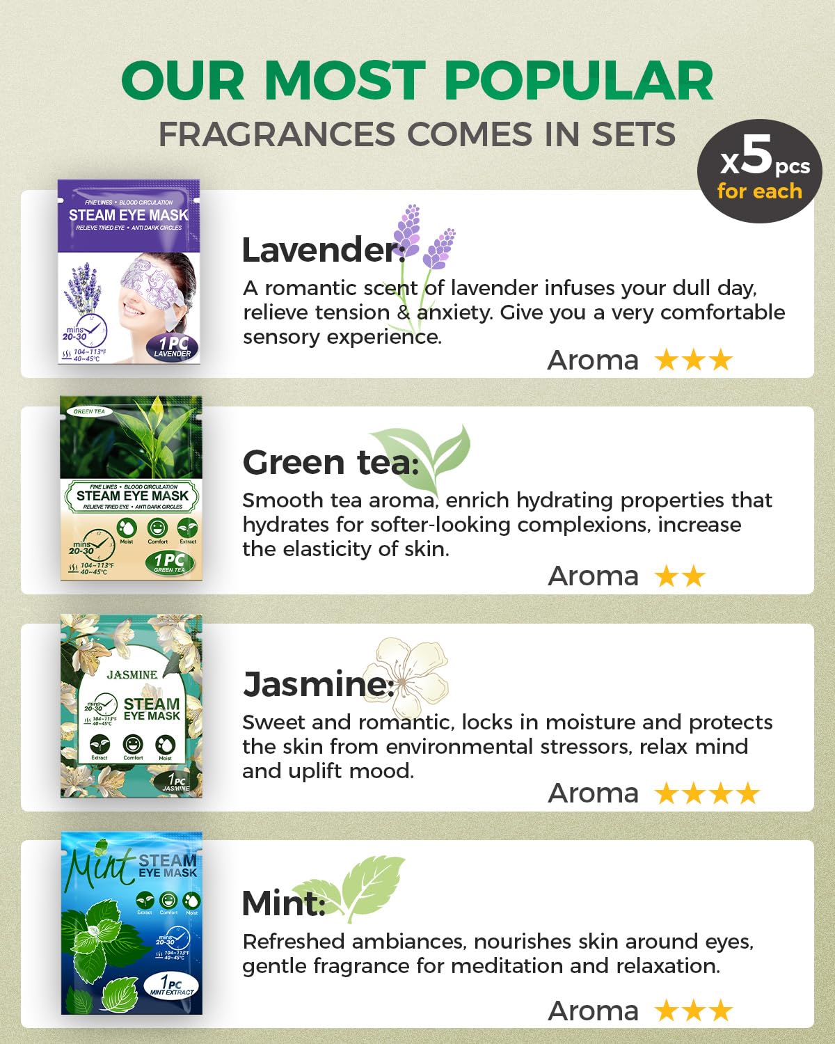 - 【Premium 4 Flavors Collection】The gift box comes with Lavender, Green Tea, Jasmine & Mint steam eye mask. 5pcs for each fragrance. Suitable for first-time users, who want to experience different flavors.