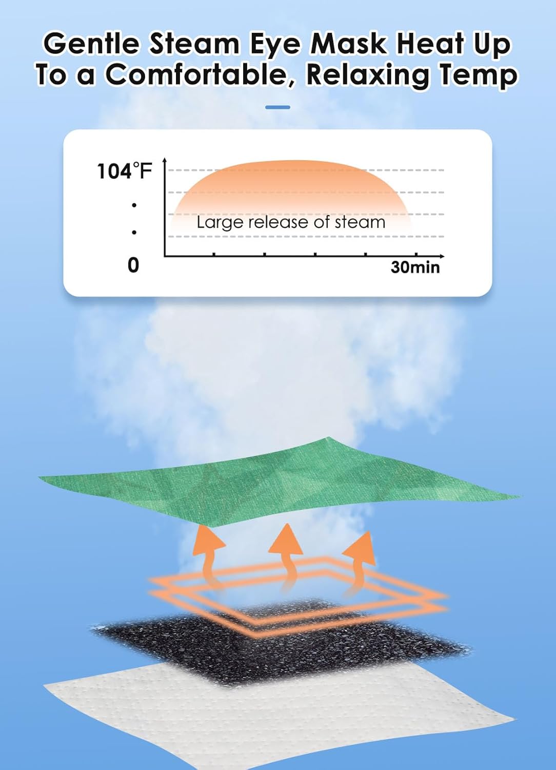 - The Best Solution for Dry Eyes: The steam eye mask releases gentle steam during warm compress, which penetrates deep into the skin, relieving dry eyes and fatigue, moisturizing the eyes, reducing eye puffiness and dark circles. Natural lavender extract helps soothe nerves and improve sleep quality.