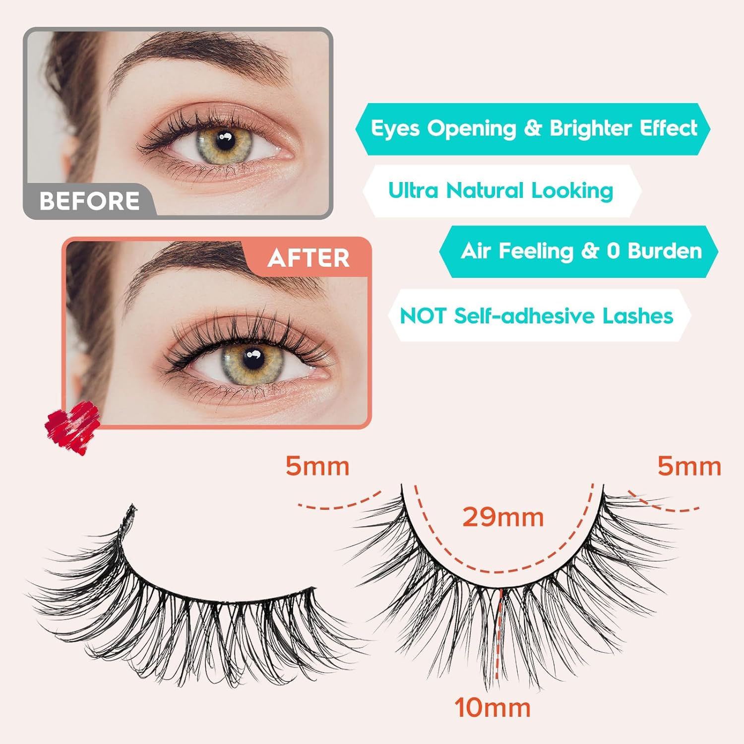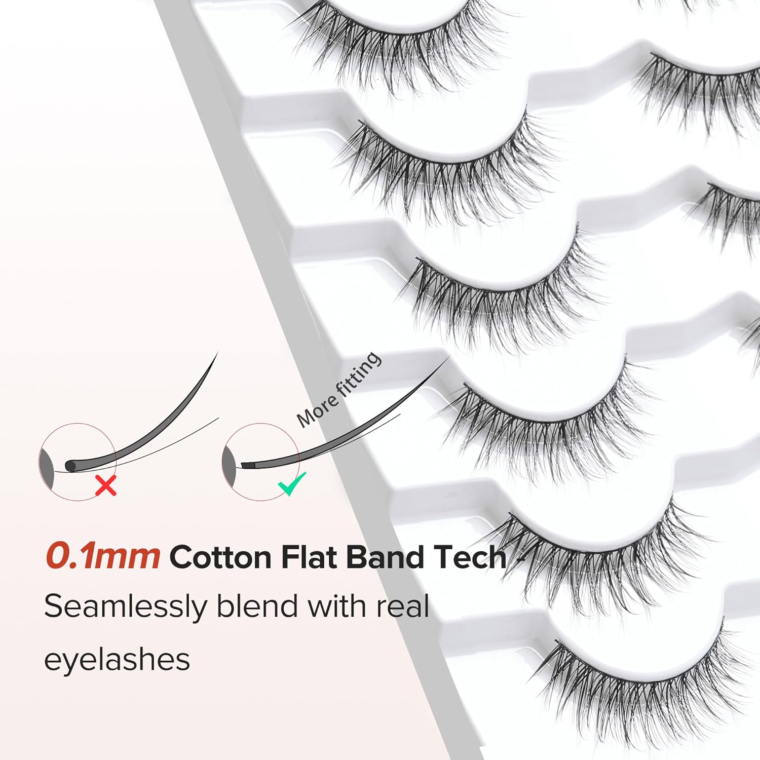 - THIN BAND FALSE EYELASHES: The wispy eyelashes use 0.1mm thin cotton flat band tech, seamlessly blend to your real eye lashes. Incredibly flexible, easy to bend and stay well on, beginner friendly