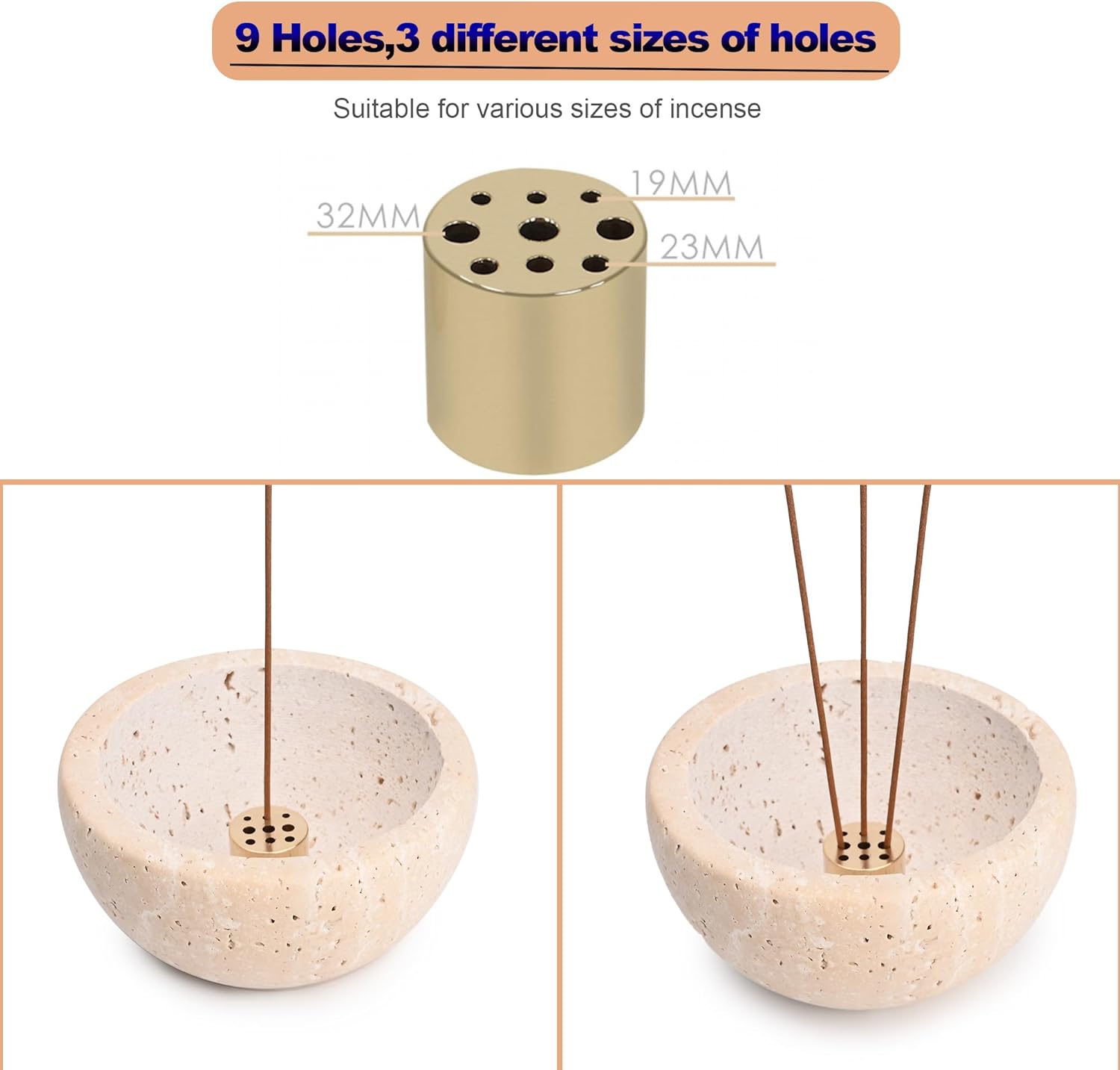 - Multi-Functional Ash Catcher Featuring a versatile 9-hole design, this incense holder accommodates various sizes of incense sticks and cones effortlessly. The bowl-shaped ash catcher efficiently collects ash, maintaining a neat and clean environment.