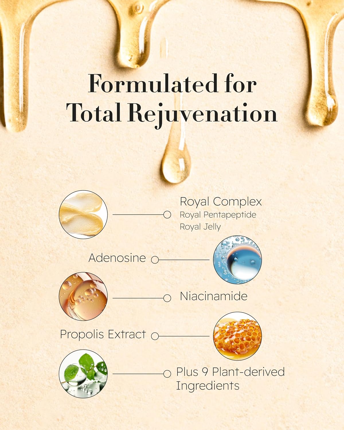 - ROYAL COMPLEX & NUTRIENT-RICH INGREDIENTS - Experience the power of Royal Complex, featuring Royal Pentapeptide and Royal Jelly Formula, for skin rejuvenating benefits. Adenosine, niacinamide, propolis extract, and 9 plant-derived ingredients provide comprehensive skincare, improving wrinkles, skin density, elasticity, and hydration.