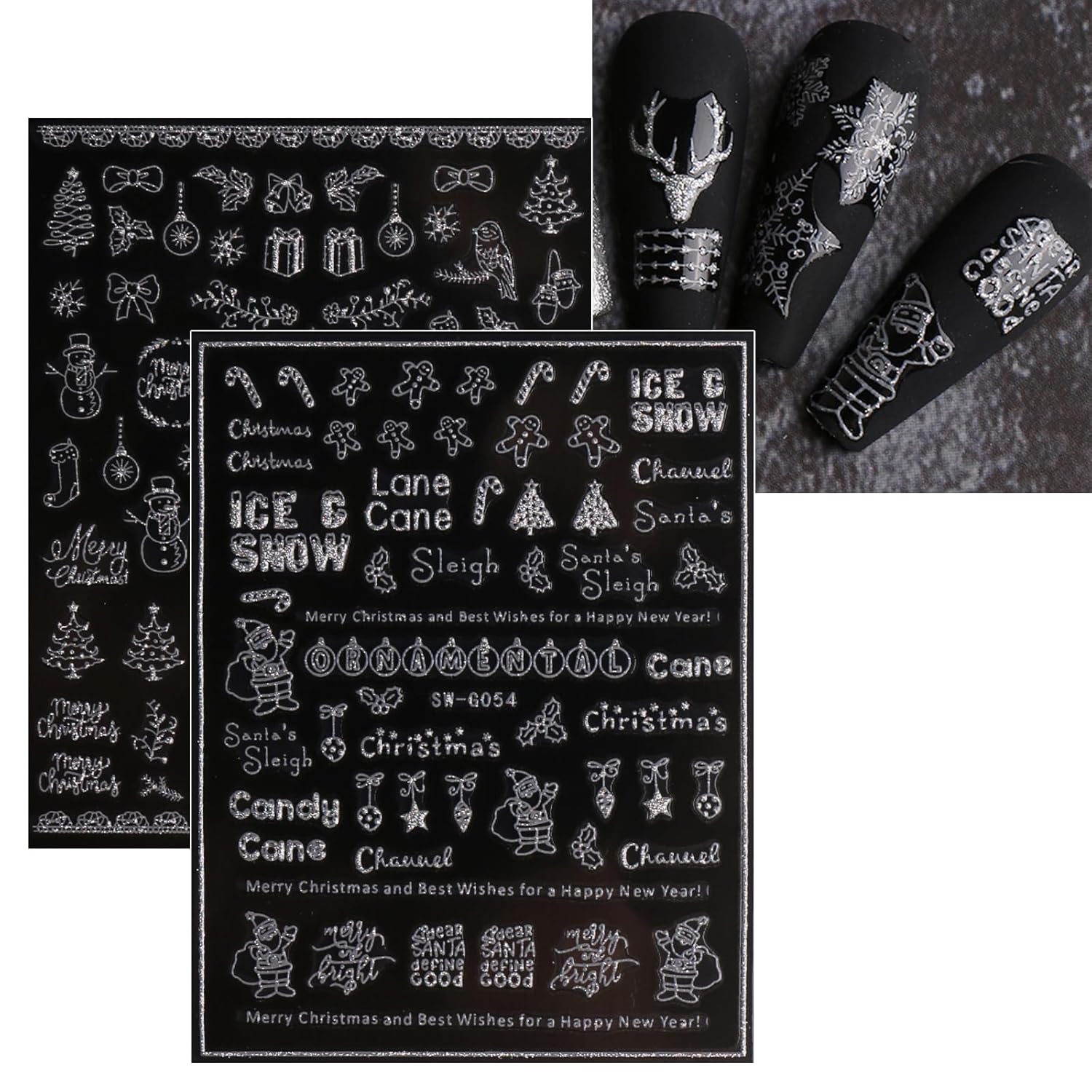 JMEOWIO 9 Sheets Christmas Glitter Nail Art Stickers Decals Self-Adhesive Snowflake Winter Holiday Silver Nail Supplies Nail Art Design Decoration Accessories