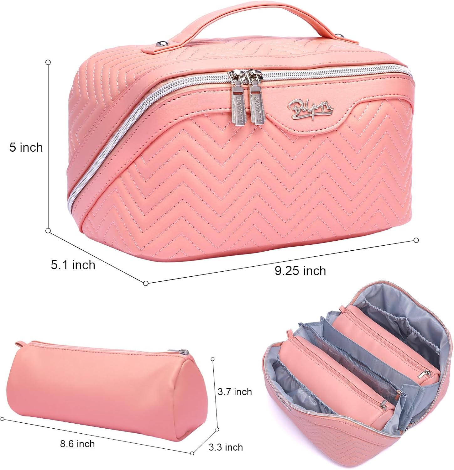 Travel Makeup Bags Cosmetic Organizer Bag: Quilted Make up Bag Set of 3 - PU Leather Toiletry Bags for Women - Portable Makeup Organizer with Compartments & Handle & Divider (14-Pink)