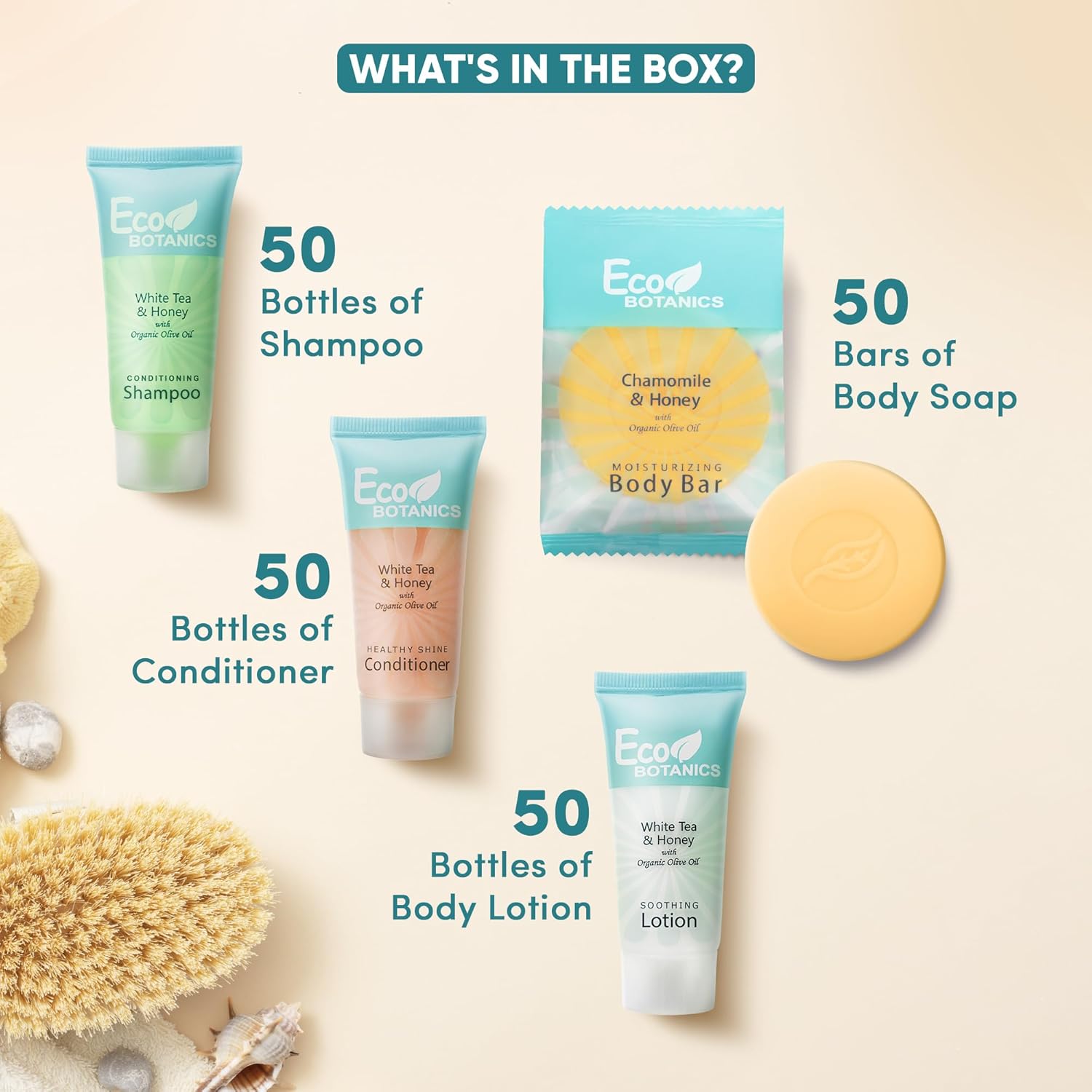 - IN THE BOX: This 200 piece mini toiletries set has everything you need to keep your guests comfortable. Your hotel kit includes 50 of each: Shampoo, Conditioner, Lotion & Soap Bar. Naturally scented with chamomile and honey for an invigorating and refreshing scent!