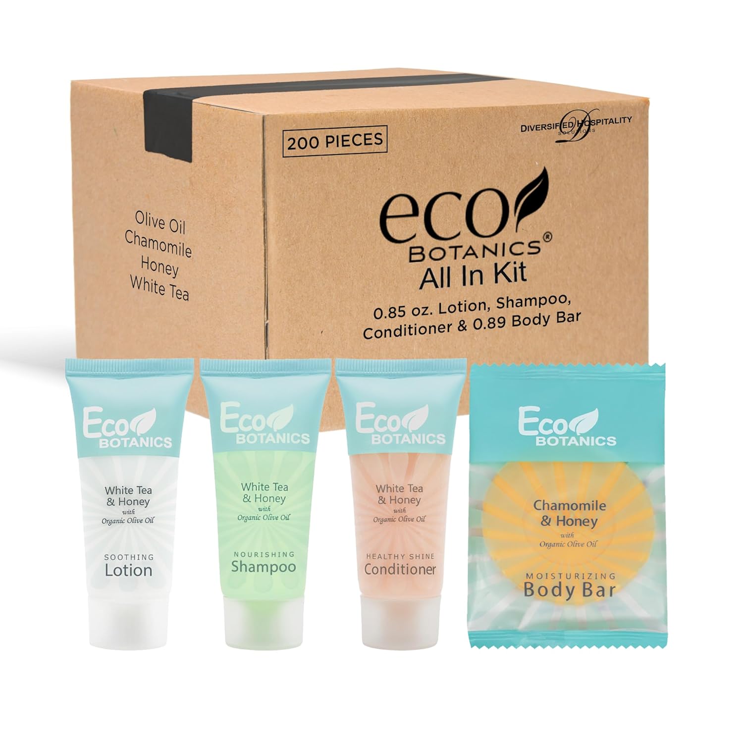 Eco Botanics Hotel Soaps and Toiletries Bulk Set | 1-Shoppe All-In-Kit Amenities for Hotels & Airbnb | 0.85 oz Hotel Shampoo, Conditioner & Lotion, 0.89 oz Bar Soap Travel Size | 200 Pieces