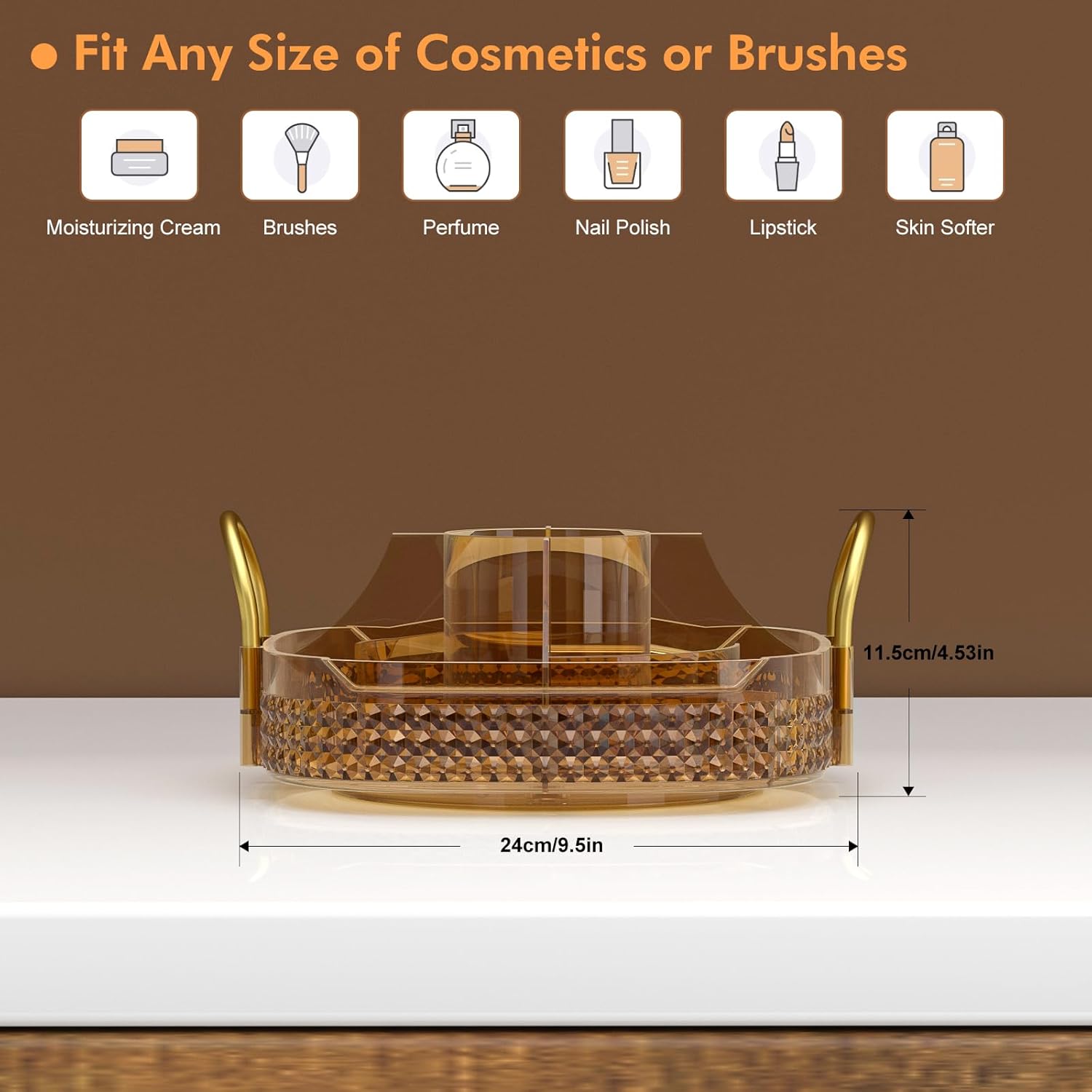 - Multifunction:➤The spinning organizer can be used to store cosmetics, such as:perfume, brushes,nail polish, lipstick,eye shadow,makeup powder, or store bathroom supplies, such as:toothbrush, toothpaste,razor,body lotion.You can use non-compartmented plates as food display plate to store vegetables, fruits, pastries, snacks, etc, or store condiments.