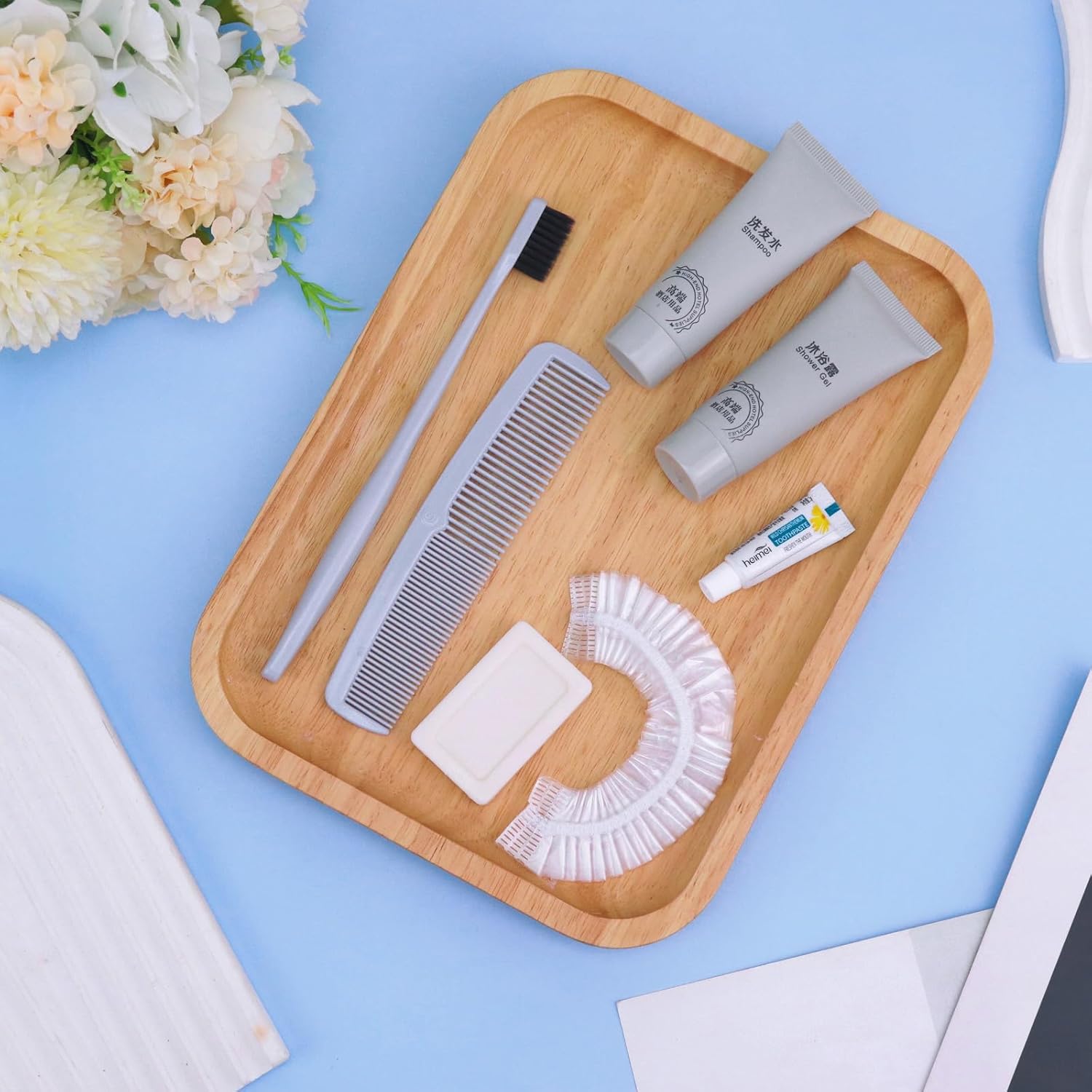 - More sets to match: our hygiene travel kit comes in a pack of 12 sets. Each travel size hygiene products bulk set consists of a Toothbrush, toothpaste, comb, bath gel, shampoo, soap and bath cap. 7 items in a set. personal care travel size toiletries make it even more comprehensive, convenient and comfortable to use.