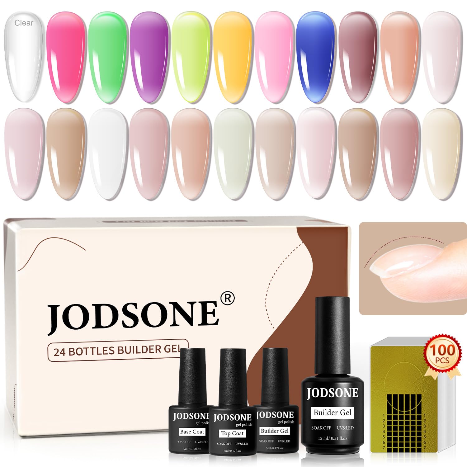 - Items Included: 22 bottles of colorful building gel(Clear builder gel is 15ml, the others are 5 ml;1 bottle of base coat and top coat (both are 5 ml), 100 pieces of extension stickers.