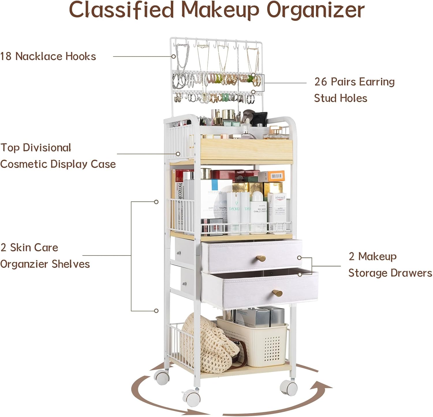 - 【4 Swivel Casters】Comes with four 360° swivel casters, this cosmetics display case can be moved and positioned freely, allowing you to conveniently use your cosmetics and skincare wherever needed. Built-in brakes on two casters to secure it in place and add stability.