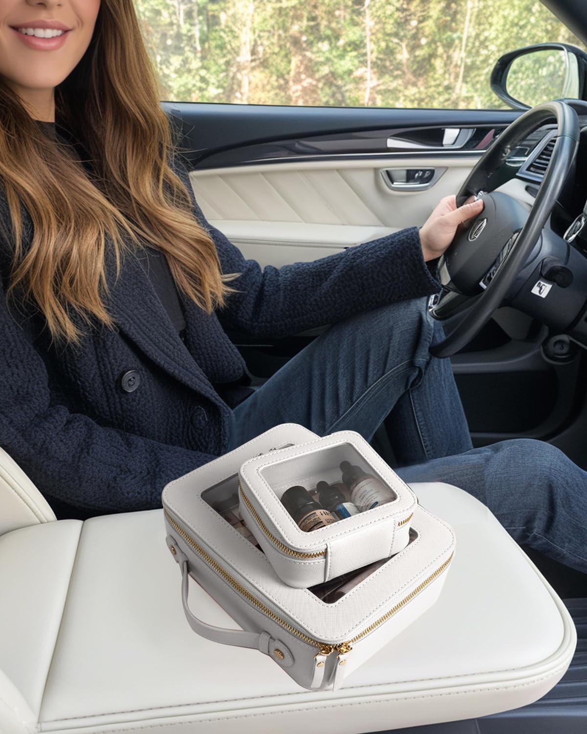 - Clear Design: Our clear toiletry bag set is sleek and minimalistic look for your makeup accessories collection. And is designed with a clear PVC window,all items are clear at a glance, and you can quickly choose the cosmetics you need. Large: 9.44“ x 6.1” x 2.7”, Mini: 5'' x 4.7'' x 2''