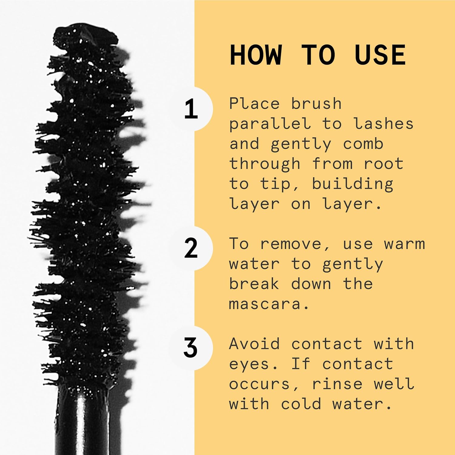 - How To Use: Place brush parallel to lashes and gently comb through from root to tip, building layer on layer. To remove, use warm water to gently break down the mascara. Suitable For: Sensitive skin / eyes. (Avoid contact with eyes. If contact occurs, rinse well with cold water. Keep out of reach of children.)