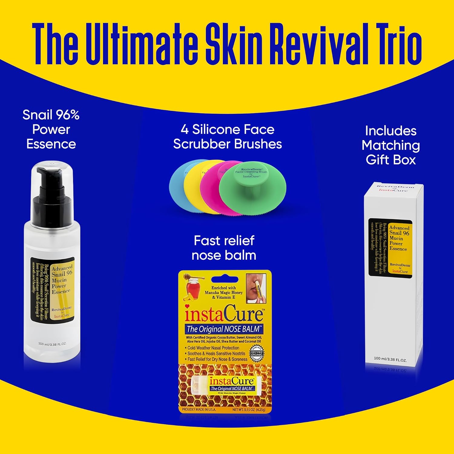 - UNLOCK A YOUTHFUL GLOW: InstaCure’s complete skincare & beauty bundle includes a deeply hydrating snail mucin serum, 4 x silicone facial cleansing brushes, and a dry nose balm