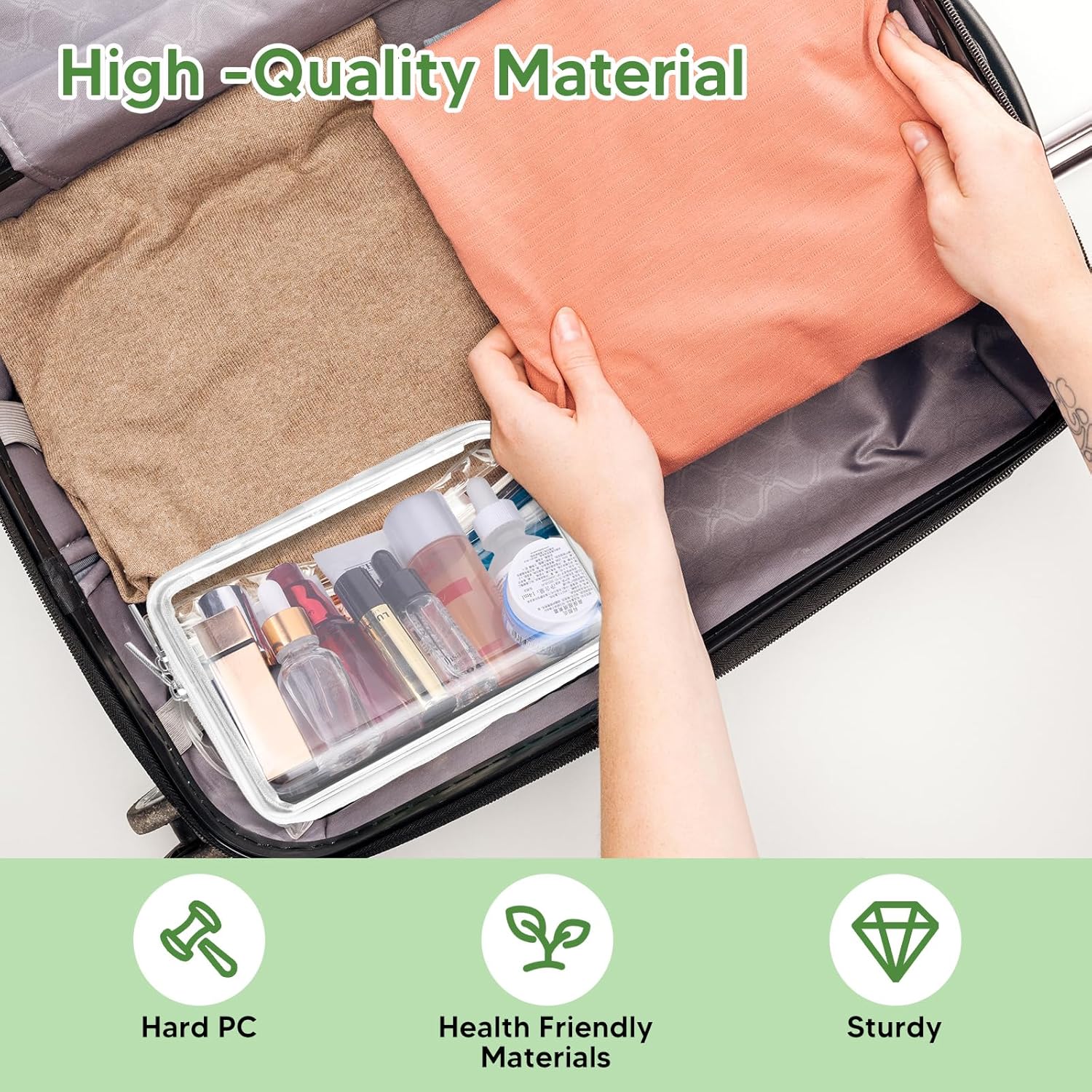 - HIGH QUALITY MATERIALS: The hard shell clear pouch are made from premium hard PC material, ensuring reliability and durability. It is more durable and convenient kit ensures that your travel makeup or toiletries well organized. No longer worry about travel toiletry bag splitting easily and cosmetics spread anywhere!