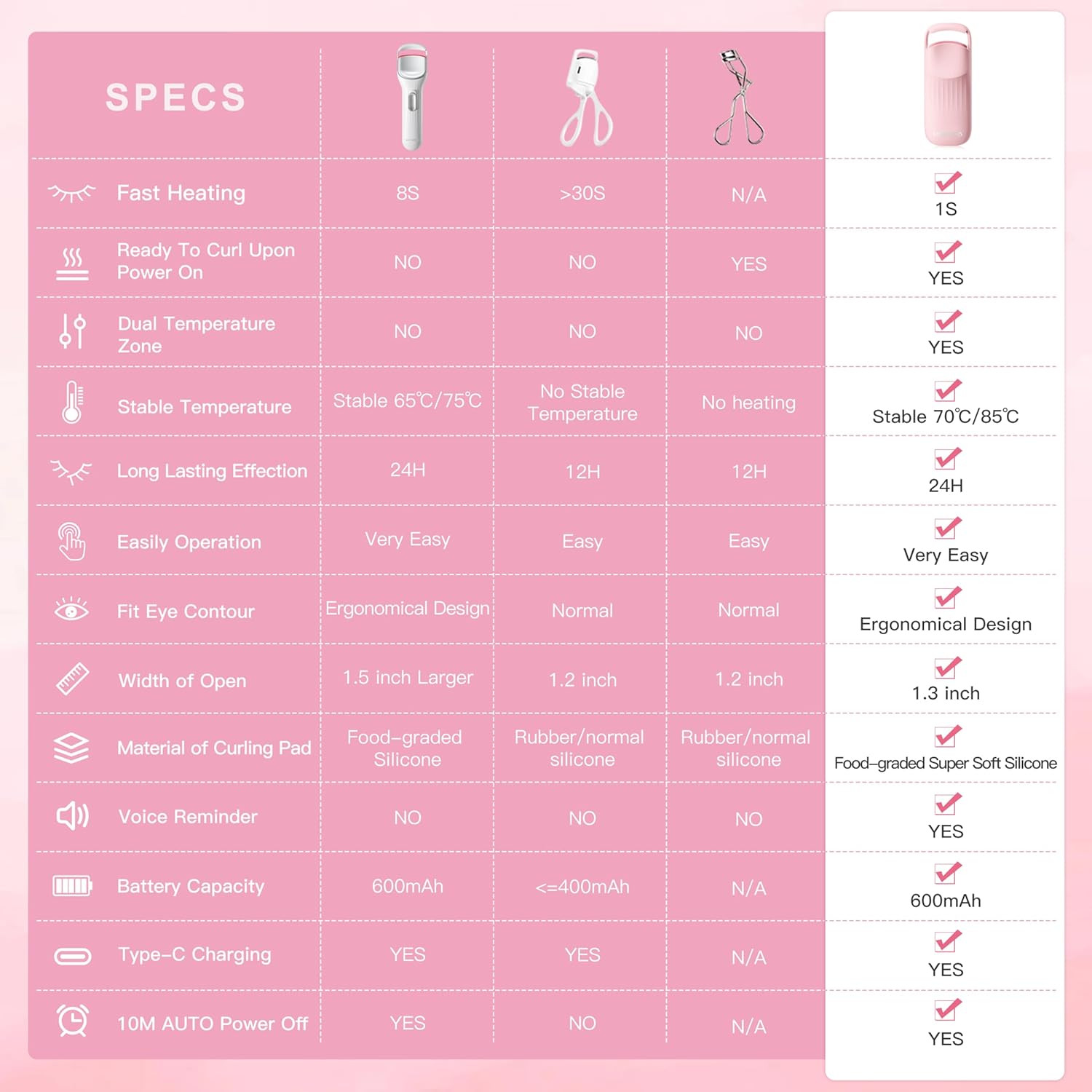 - 1S Quick Warm-Up for Busy Mornings: HEBECA's QuickCurl heated eyelash curler is designed to provide a quick, safe, and effective curling experience. it features Instant Heat Technology ultra-fast 1S heating up, providing instant curling with minimal waiting than others, Due to the innovative design of our eyelash curler, its usage differs from traditional models. To ensure optimal results and safety, please read the instruction manual carefully before use.