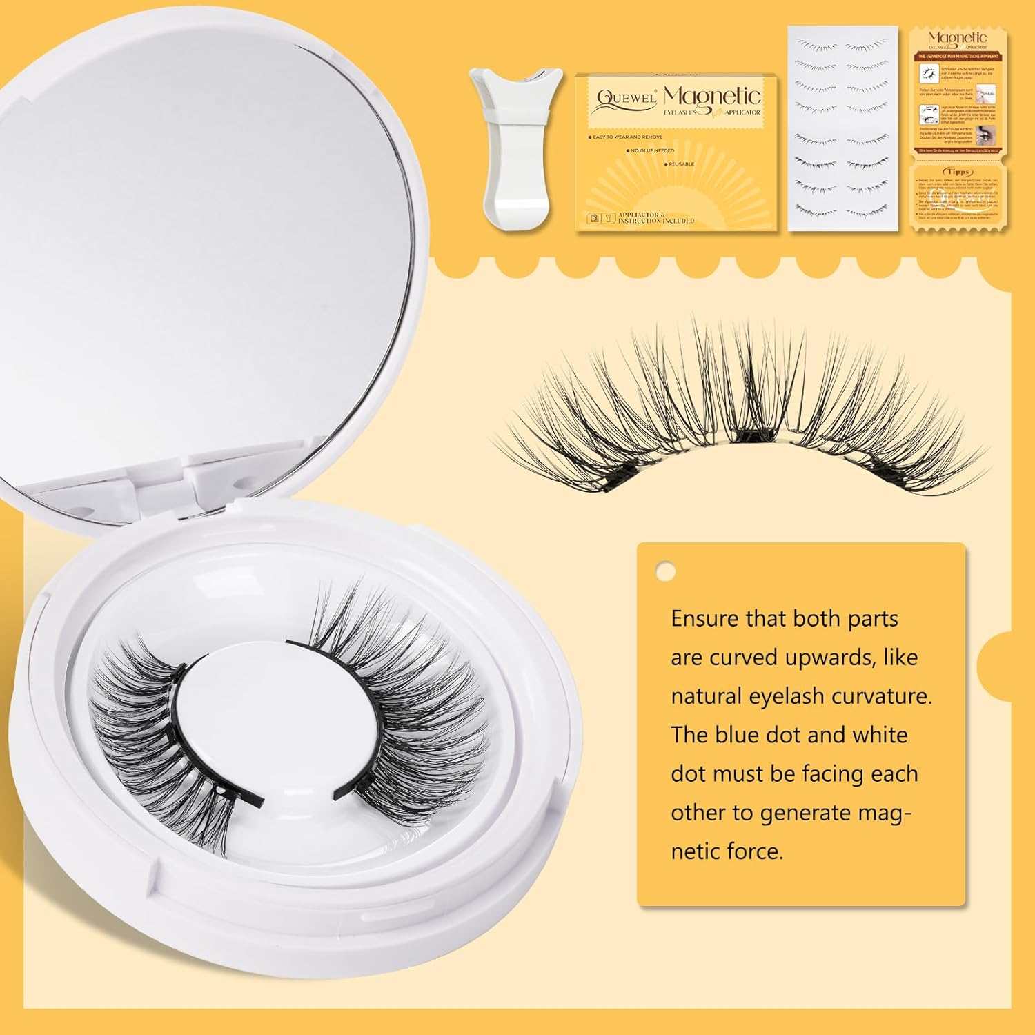 - Magnetic Eyelashes Kit: The magnetic lashes kit includes 1 pair of magnetic eyelashes, 1 magnetic applicator, 1 small magnetic box with a mirror, and one instruction sheet. Magnetic lashes are easy to operate and only take 2 minute to complete, effectively saving your makeup time and allowing you to stay on through an entire sweaty rave!