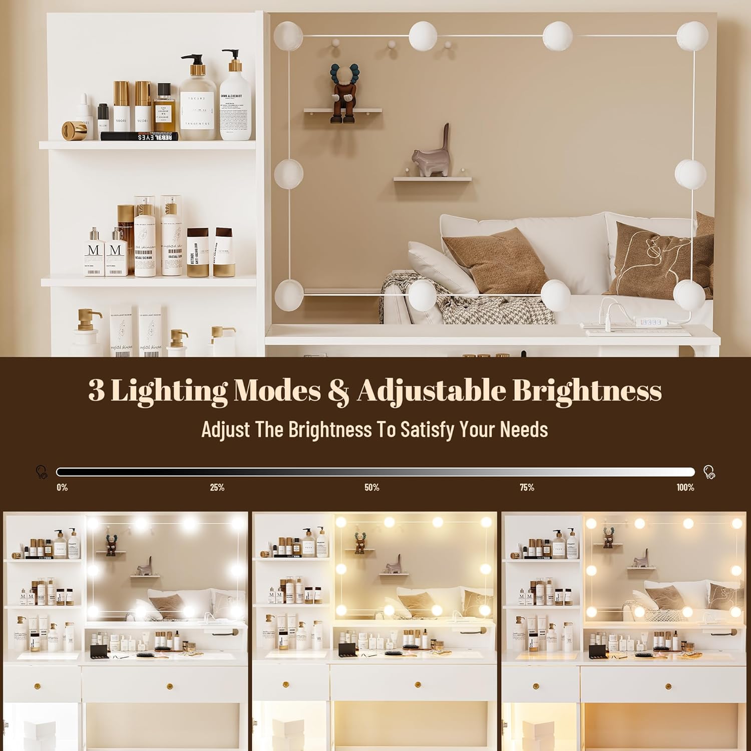 - ăAmple Storage Spaceăwhite vanity with lighted mirror offers a compact design without compromising on storage capacity. With 2 drawer, 3 shelves, and a acrylic 2-tier storage cabinet, you can easily store and access all your makeup essentials, jewelry, perfumes, hair straighteners, and more.