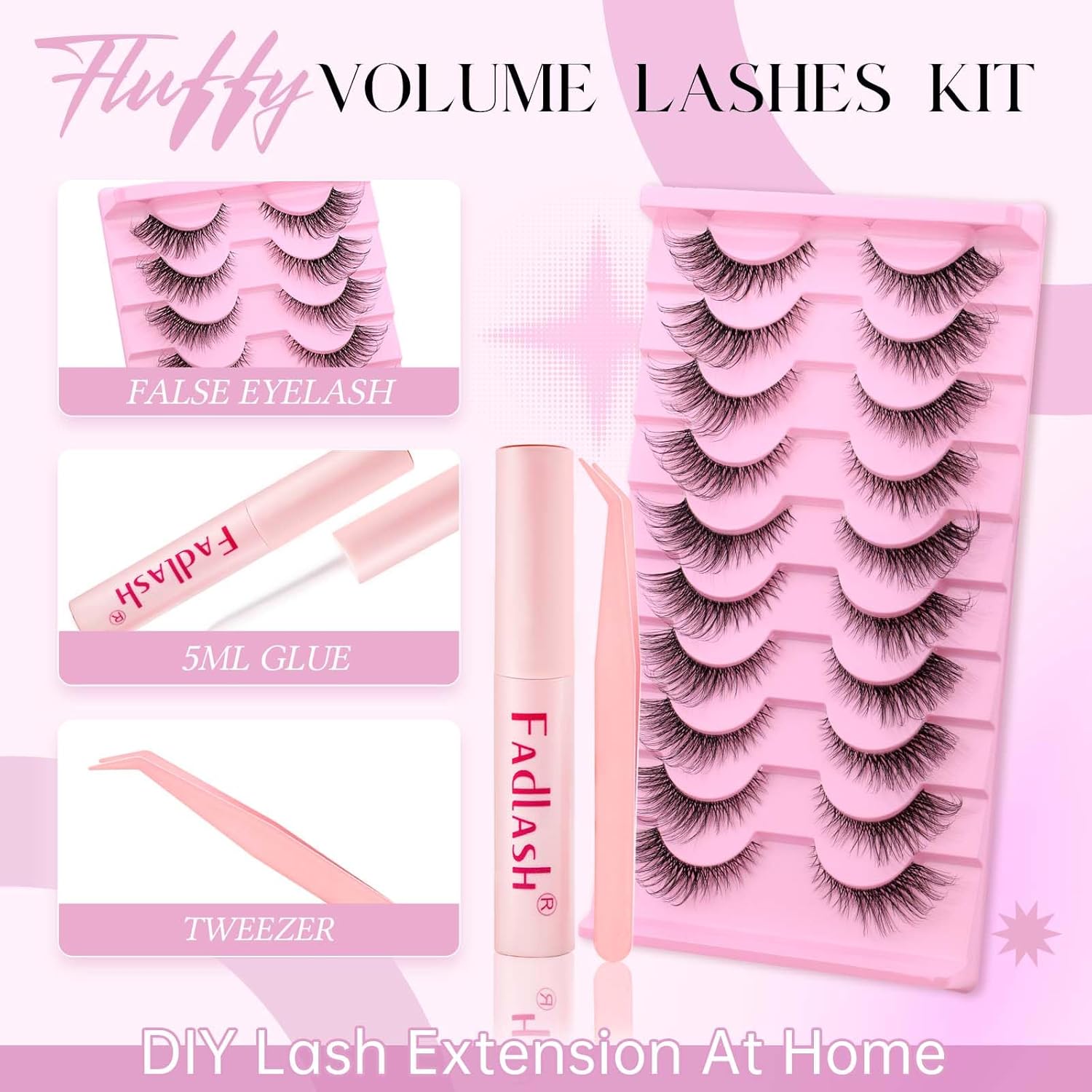 FADLASH False Eyelashes Kit Black Natural Cat Eye Lashes with lash bond Wear Comfortable Fake Lashes with Thin Band 10 Pairs Lash Applicator Tool at Home, BY003