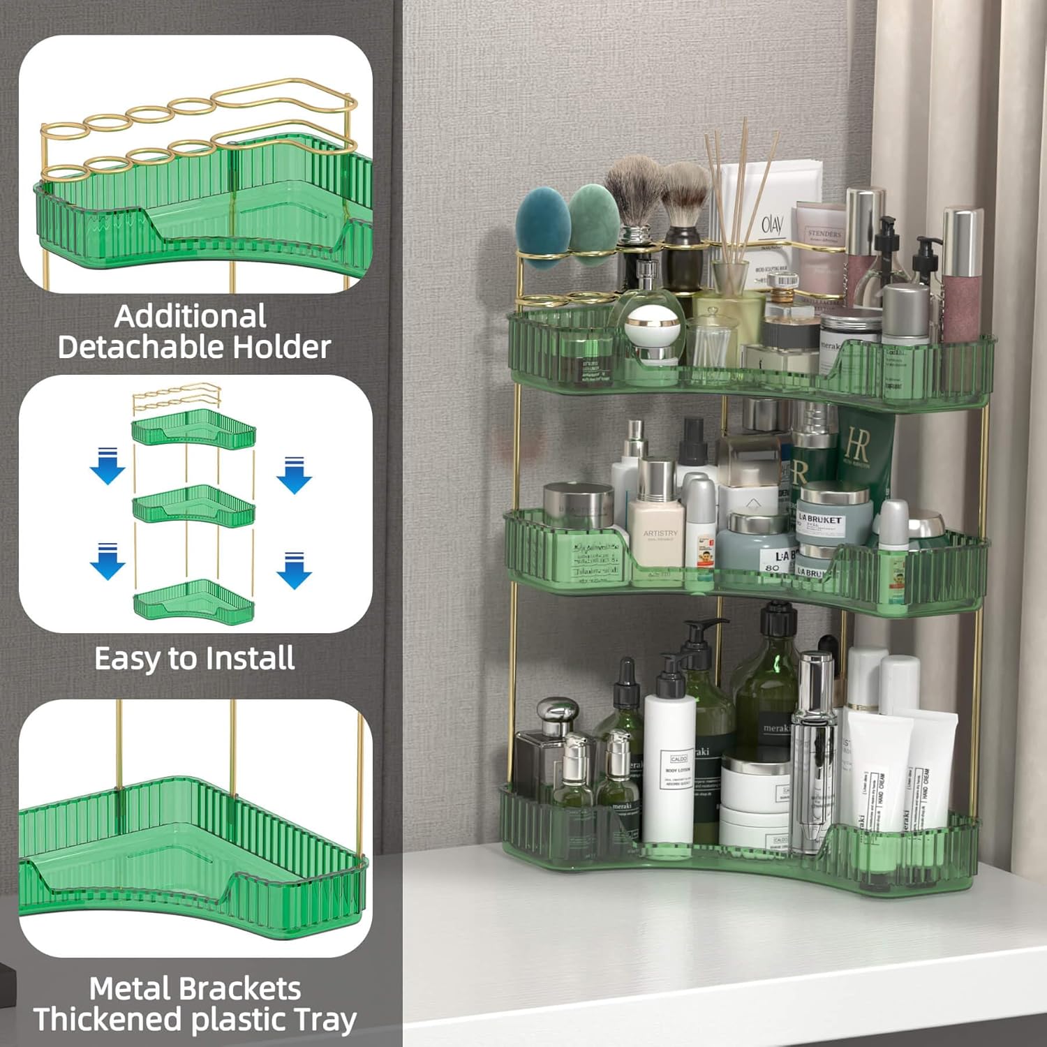 - 【Makeup Organizer Countertop With Brush Holder】The corner bathroom countertop organizer has a new compartmentalized metal holder at the top, which not only organizes makeup brush beauty egg , but also toothbrushes and more!
