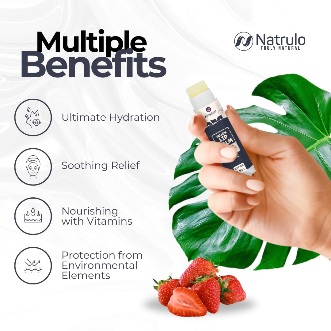 - INTENSELY HYDRATING FORMULA: Immerse your lips in moisture with our grass-fed organic beef tallow lip balm with strawberry flavor. Crafted with natural fats, akin to those in human skin, it maintains your lips' moisture barrier for enduring hydration and velvety softness.