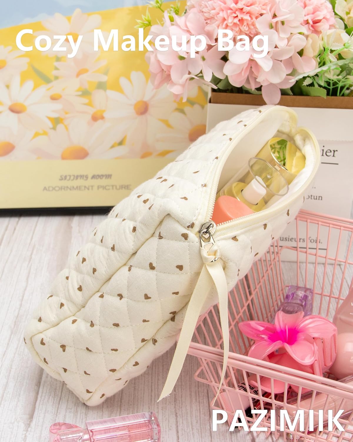 PAZIMIIK 3PCS Makeup Bag SET Large Travel Quilted Zipper Soft Cosmetic Case Pouch for Women Girls Make Up,Gauze Heart Coffee