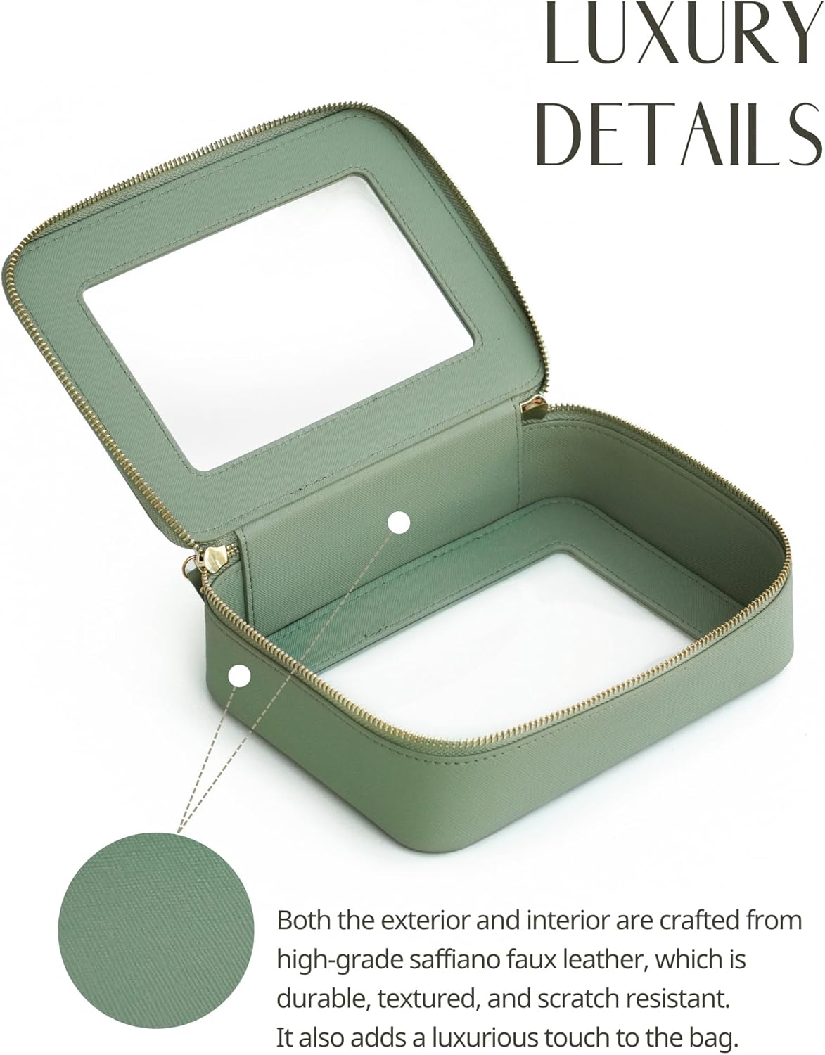 • [Premium Material and Durability] – The clear cosmetic case, both the exterior and interior, is crafted from high-grade saffiano faux leather, which is highly scratch resistant, durable and exceptionally easy to keep clean. It features a smooth zipper for secure closure, and elegant light gold metal hardware accents, adding a luxurious and sophisticated touch to the bag's overall design.