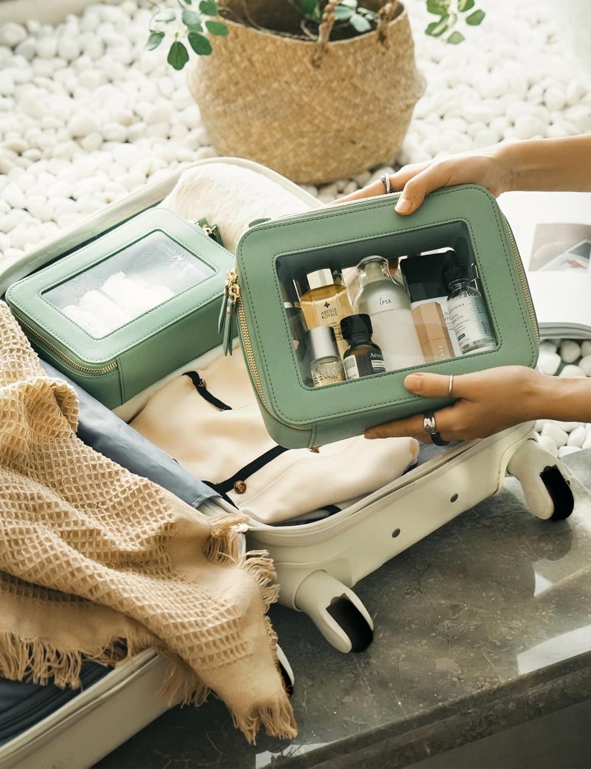 • [Two-Piece Set] – The clear bag set consists of two different sizes, specifically designed to separate makeup and skincare products effectively. The medium size measures 8.3'' x 6.1'' x 2.4'' (21cm x 15.5cm x 6cm), the large size measures 9.6'' x 7.5'' x 3.1'' (24.5cm x 19cm x 8cm).
