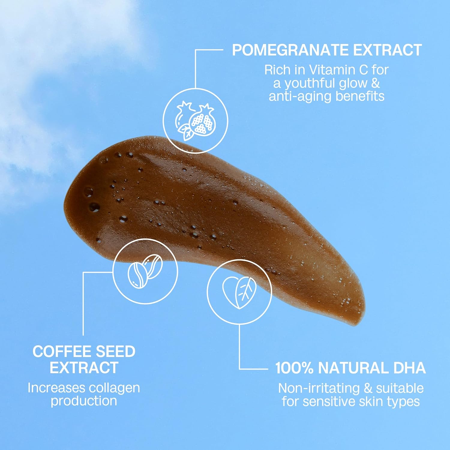 - ššš±šæš®šš¶š»š“ šš¼šæšŗšš¹š® šš¼šæ š¦š¼š³š, š š¼š¶ššššæš¶šš²š±: Skin Our self tanning mousse doubles as skincare, addressing dry skin concerns with premium hydrating ingredients. Formulated with soothing chamomile extract to calm sensitivity sunless tanner , antioxidant-rich coffee seed extract to fight free radicals, and rejuvenating pomegranate extract for intense moisture.