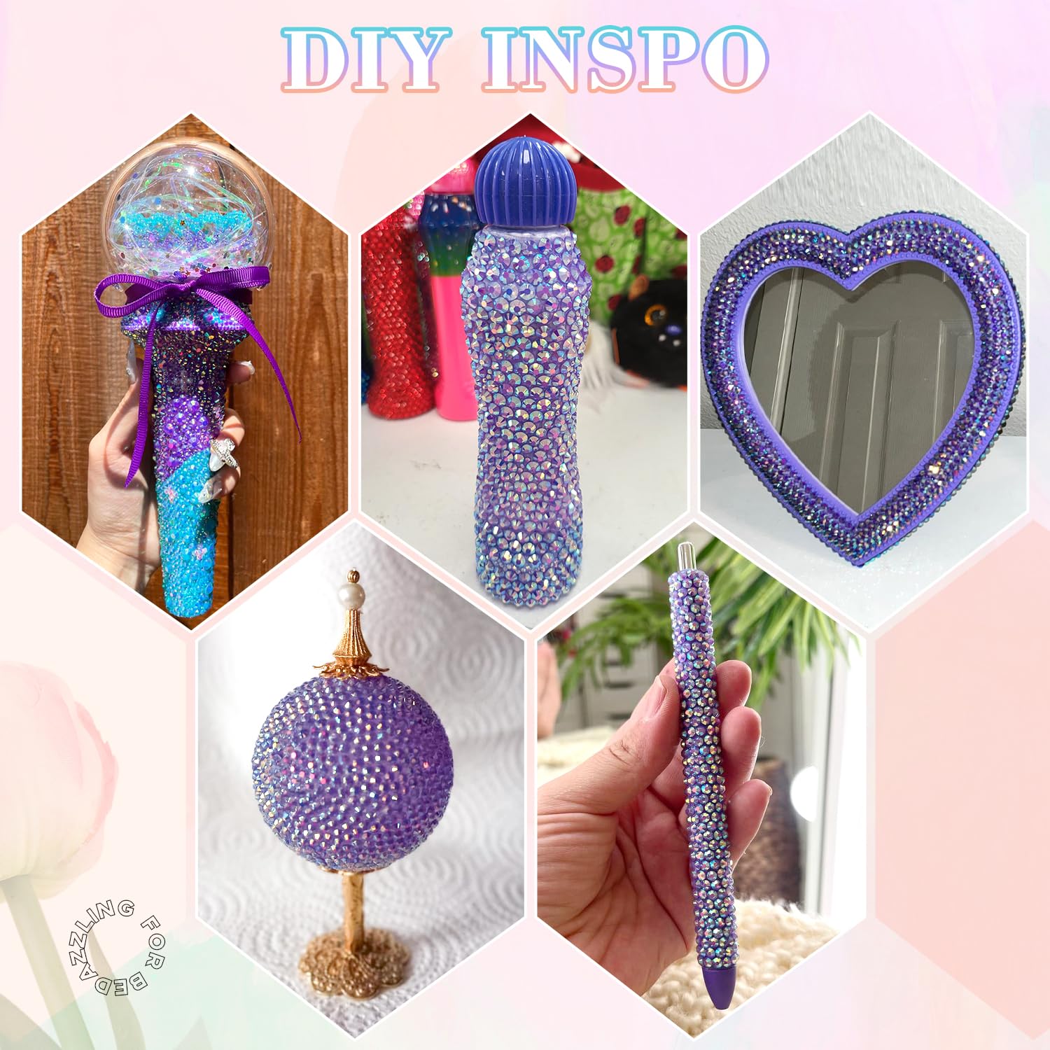 - PACKAGE CONTENT – This all-in-one bedazzler kit includes everything you need to start creating dazzling designs: 1 box of Dark Purple AB rhinestones with 24 grids (approx. 30,000 pcs of bedazzling rhinestones assorted size SS6/10/16/20/30 ), 1 precision tweezers, 1 pickup pen for handling small gems, and 3 tubes of B7000 jewelry glue for secure application.