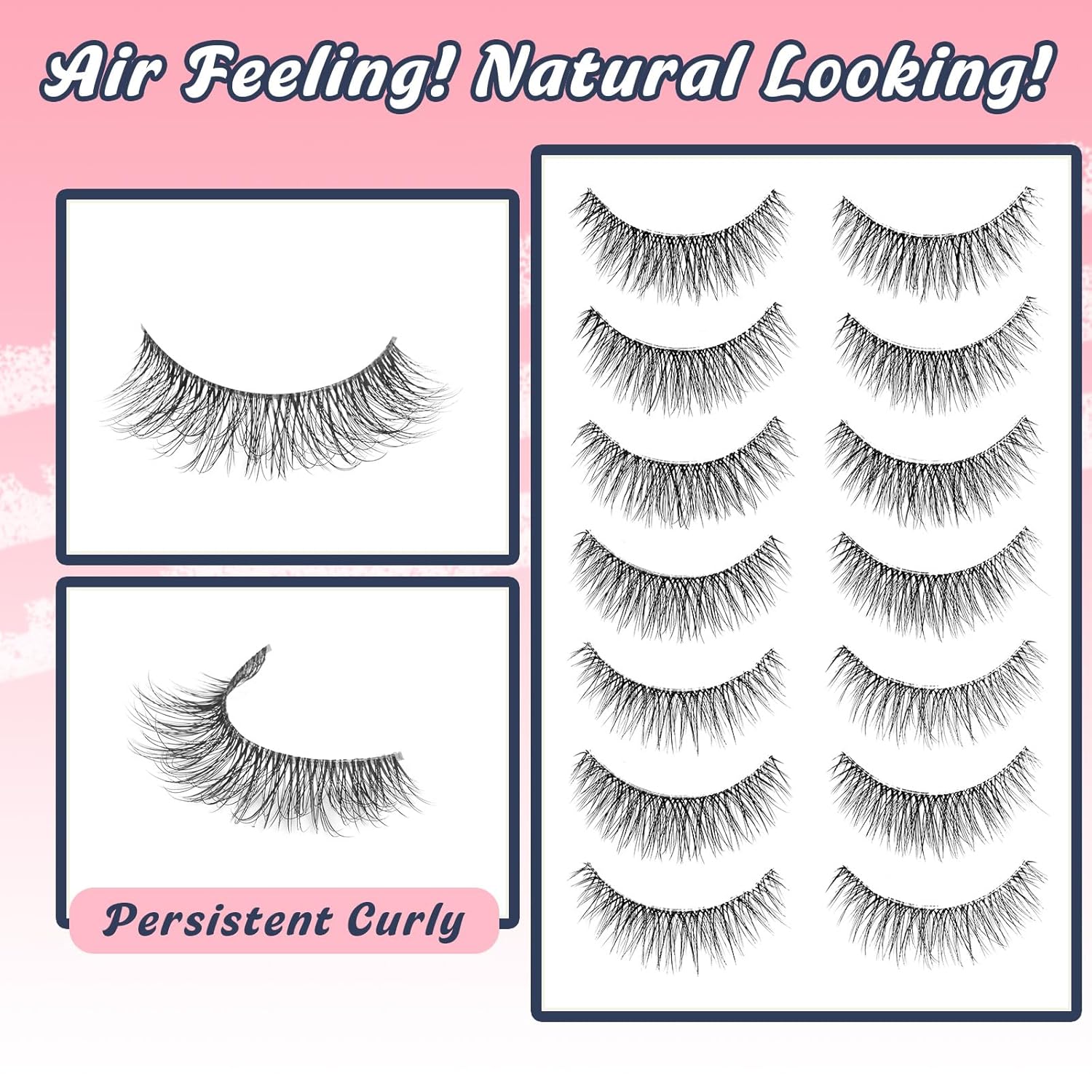 - VEGAN & REUSABLE NATURAL LASHES: 7 pairs lashes pack. The fake lashes use ultra-light soft faux mink synthetic fibers, cruelty-free, skin friendly and all day curl lasting. Perfectly suit for DAY-TO-DAY use, vacation party or date and all of age