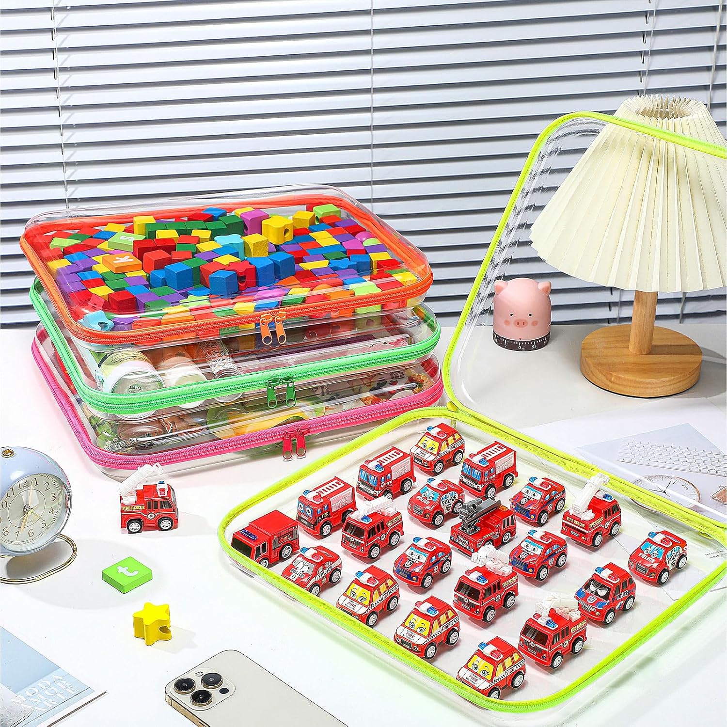Hoolerry 4 Pcs Hard Clear Zipper Case Makeup Bags Plastic Pencil Pouch Transparent Storage Box Containers for Cosmetics, Snacks, Building Blocks, Puzzles(Fluorescent,13.8 x 11.8 x 2 in)