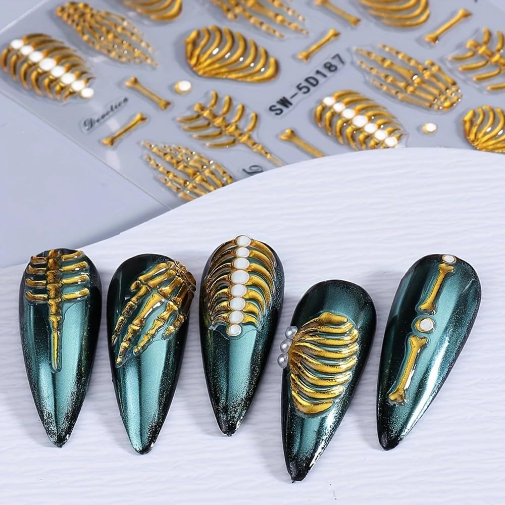 3Pcs Skull & Ribcage 5D Nail Stickers - Y2K Gothic Horror Design, Self-Adhesive Foil Decals Halloween Nail Art, Single-Use Plastic Embossed Animal Print, Golden, White, Rose Gold Skull Nails Decals