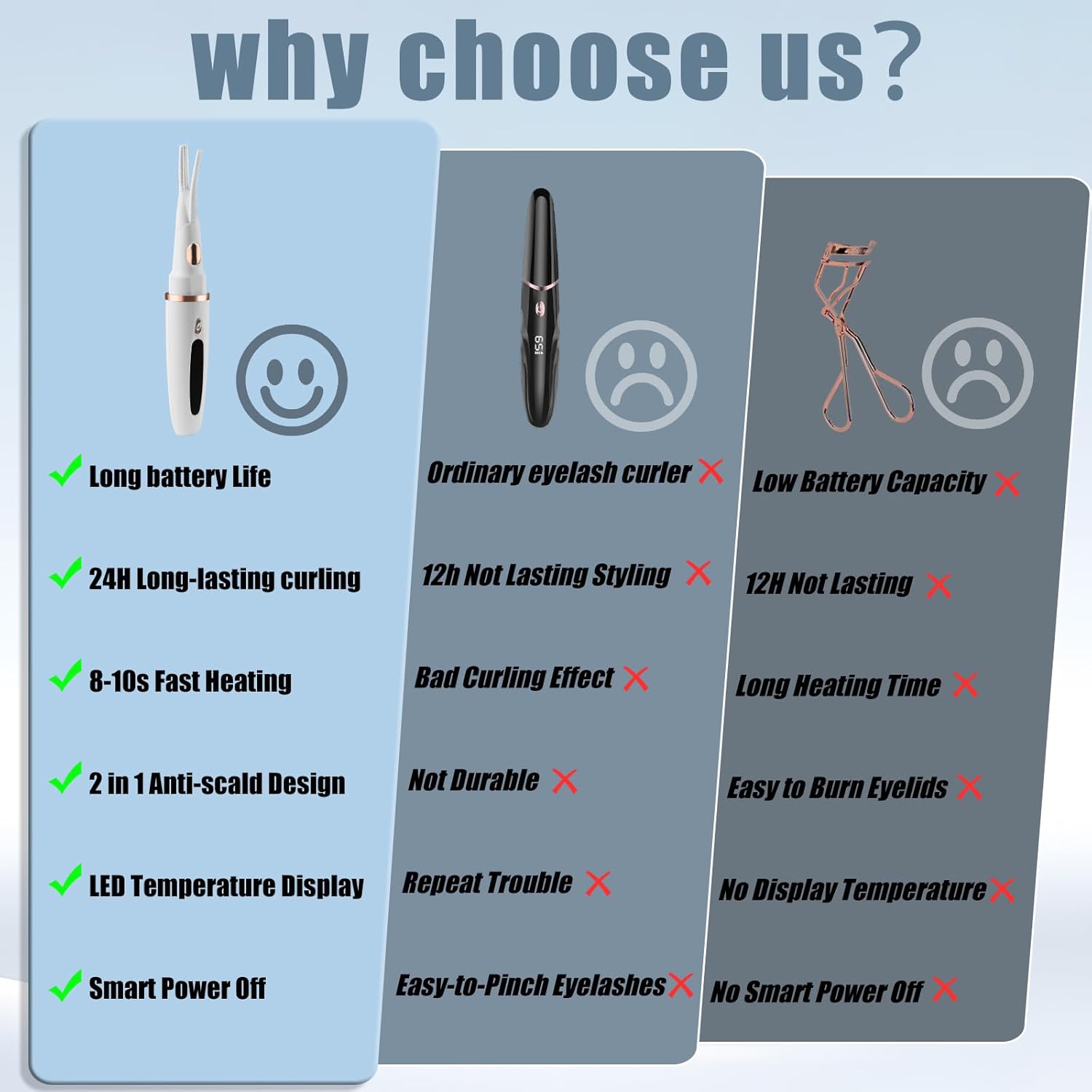 - Adjust Temperature Mode - Our heated eye lash curler comes with 3 temperature settings from 150°F to 190°F to gently curl your lashes and create stunning curls for amazing curling effect for different types of eyelashes, will not frizzing or pinching them